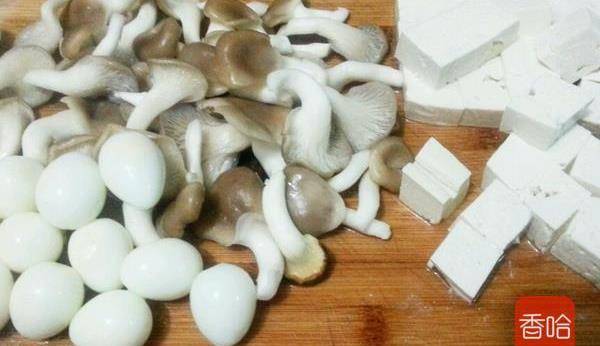 4.蘑菇洗凈,豆腐洗凈切塊,鵪鶉蛋剝殼