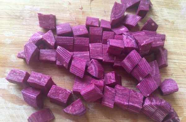 6.銀耳煲上一小時左右將紫薯丁放入鍋中,再煲上十五分鐘。