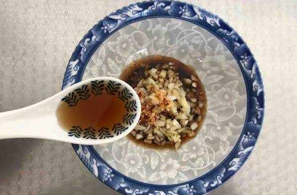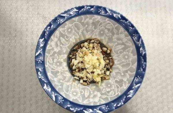 然後我們把生薑清洗幹凈,消掉它的外皮,把生薑切成薑末,把大蒜去掉外皮切成蒜末,將它們一同放在這個調味汁的碗中。