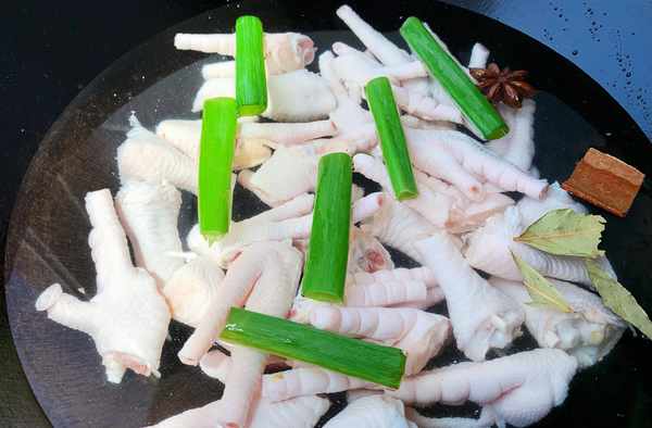 2、把洗好的雞爪冷水下鍋,加2湯匙料酒和1湯匙陳醋,再放入1粒八角、1塊桂皮、1片香葉和幾根香蔥段,大火燒開後轉中小火煮15分鐘左右。