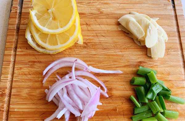 4、把檸檬、蒜頭切片,洋蔥切絲,香蔥切段備用。