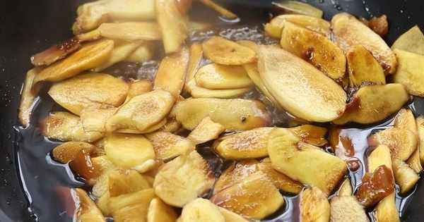 第三步,當把薑片煸炒至深黃色,外皮變硬時,放入適量紅糖,慢慢熬化。