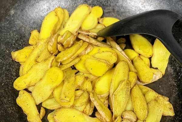 第二步,把鍋燒幹一些,放入薑片,用小火慢慢煸炒一會。