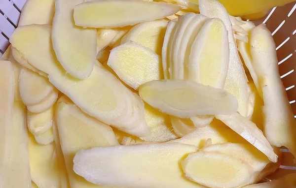第一步,把薑洗幹凈,放入筐中瀝幹水分,然後切成片備用。