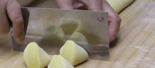 5、面團再一次揉好之後,直接用手搓成一個長條,要揉的稍微細一點。然後用刀切成幾個大小均勻,體積相等的小面劑。取其中一個小劑子,直接把它按扁,然後把邊緣位置按的薄一點。做成小面餅之後拿一個勺子舀一點糖餡放到面餅的中間,然後把它收起口來,怎麼收口都行,隻要能夠把它捏緊,保證糖餡不露出來就可以瞭。收完口之後再把它按扁,做好之後,一個餡餅生胚就這樣做好瞭,將所有的小面劑都做成這樣的面餅生胚。