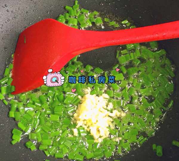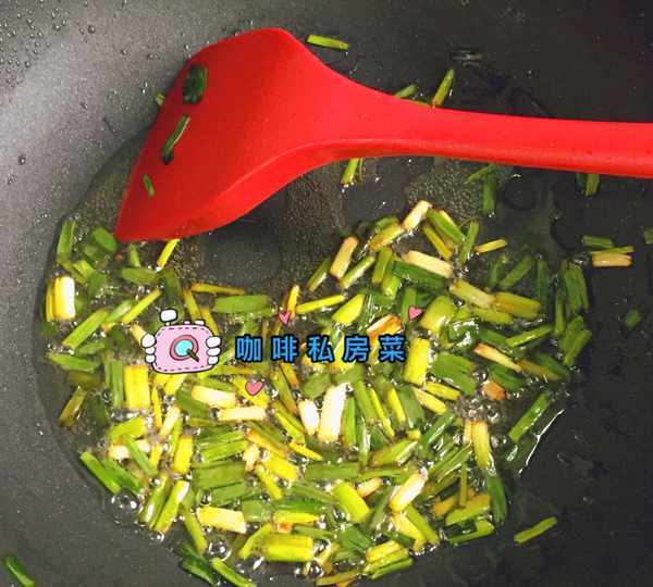倒入另一部蔥,翻炒幾下炒出香味,加入薑末翻炒均勻關火。