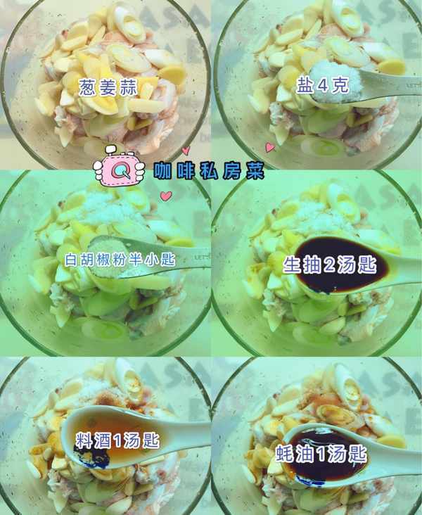 醃制雞翅:大蔥切段,薑切片,蒜切片,鹽4克,白胡椒粉半小匙,味極鮮2湯匙,料酒1湯匙,蠔油1湯匙,抓拌均勻,冷藏醃制2小時。