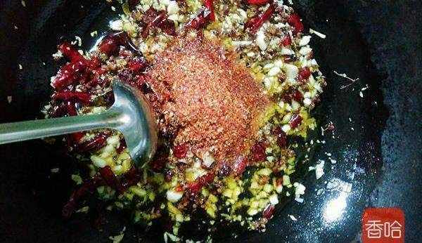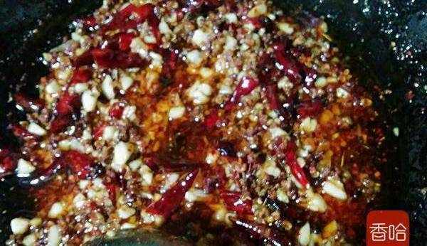 9.鍋裡倒入70克食用油燒熱放入大蒜頭,尖椒,泡椒,花椒粒,炒香!大概炒兩分鐘左右。
