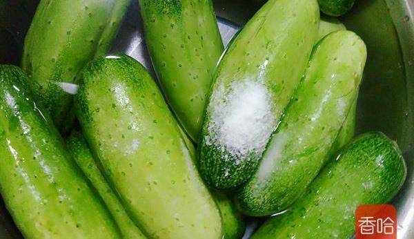 3.放入200克鹽抓勻醃制三小時等待黃瓜流出水份。
