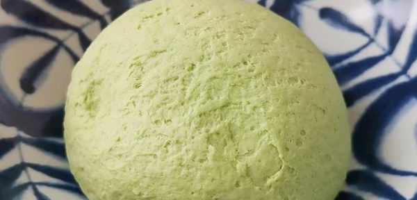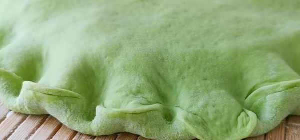 2.料理機清洗幹凈,把黃瓜皮倒入料理機裡面,再放入300ml清水,選擇果汁鍵,把它攪打成黃瓜汁,接著過濾出180ml黃瓜汁備用。準備一個盆,把面粉倒入盆裡,然後加入酵母粉,1勺鹽,1勺白砂糖,先攪拌均勻。然後一邊倒黃瓜汁,一邊攪拌,攪拌成棉絮狀,再下手揉面,把它揉成一個柔軟的面團。蓋上蓋子,發酵至2倍大。