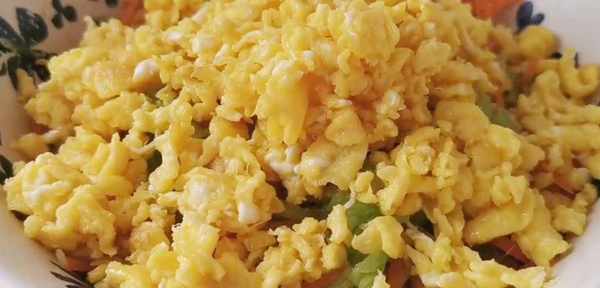 3.取一個碗,把雞蛋打入碗裡,再放入少許鹽,用筷子攪散。起一鍋,裡面放入適量的食用油,把雞蛋液倒進去,用筷子攪動,炒成雞蛋碎。醃制好的黃瓜胡蘿卜絲擠幹水,再把雞蛋碎倒進裡面,再放入1把蝦皮,既能補鈣,又能提鮮。然後開始調味,適量的胡椒粉,稍微多一點的香油,用筷子攪拌均勻,餡料就做好瞭。