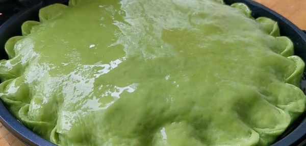 5.取一個大圓餅,再取一半的餡料平鋪在面餅上,然後把另外一張大圓餅蓋在上面。接著把剩下的黃瓜餡料平鋪在面餅上。把最後一張大圓餅蓋在上面,用手捏緊收口處,再壓出一個花邊,看著更加漂亮,我們的黃瓜面餡餅胚就做好瞭。