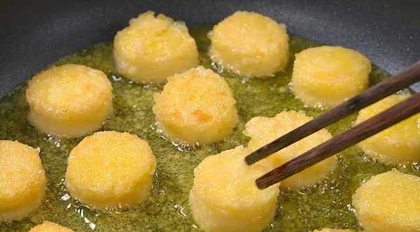 鍋中倒油,油燒好後放入粘好淀粉的豆腐煎炸,豆腐煎至兩面金黃後撈出