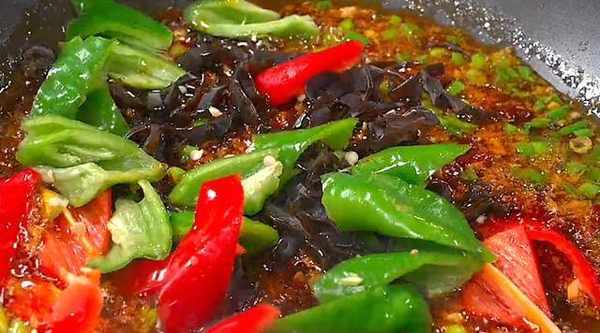 料汁翻炒均勻後倒入切好的青紅辣椒和木耳絲進去,把其和料汁翻炒均勻
