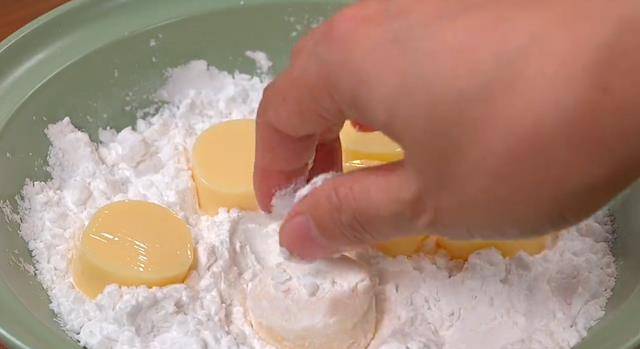 豆腐切好後在盤中倒入淀粉,再把切好的豆腐粘滿淀粉
