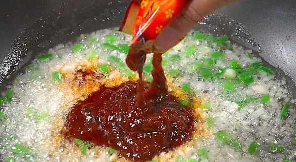鍋中倒油,油燒好後倒入蔥薑爆香,爆香後放入一包魚香調味料汁,然後把其翻炒均勻