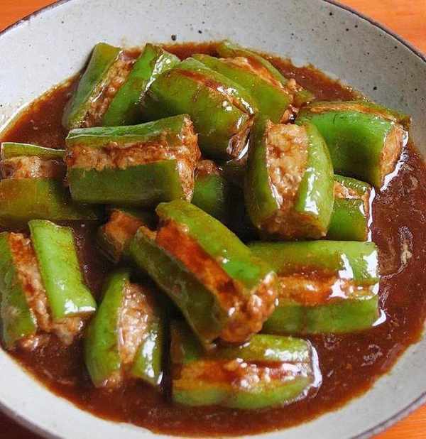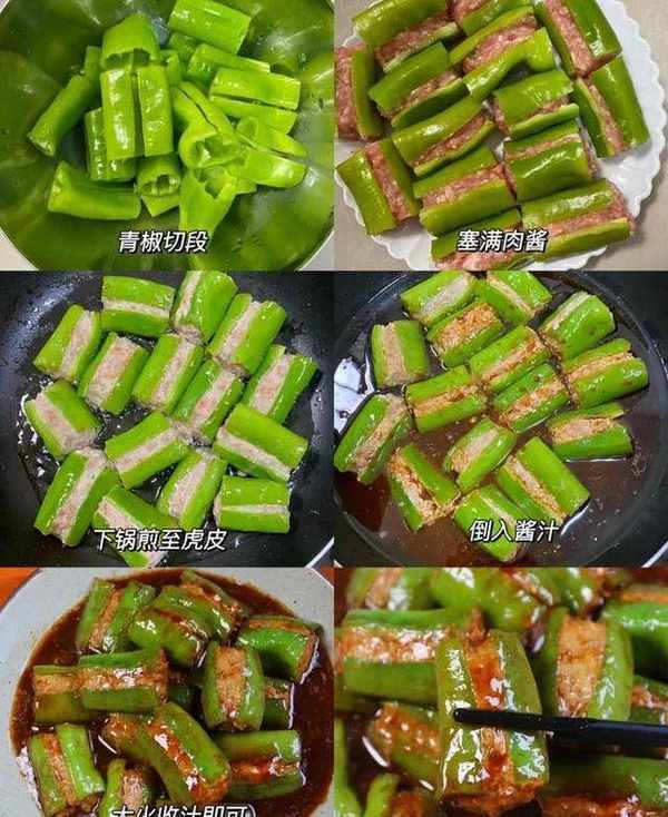 3、青椒去籽切段,劃開一刀,塞滿肉餡,鍋中少油,下鍋煎至虎皮狀,倒入醬汁,燜煮兩分鐘,大火收汁即可盛出!