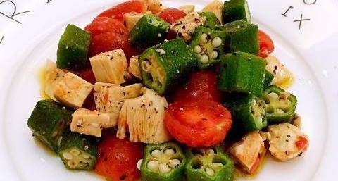 食材:秋葵,雞胸肉,小番茄,生薑、鹽、檸檬,黑胡椒,綠芥末、橄欖油。