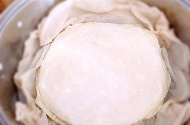 第四步:把搟好的面皮放入鋪有紗佈的蒸籠中,蒸鍋中放入適量的冷水,用大火蒸十分鐘左右後,把面皮取出,然後一層一層的把面皮撕開,再拿一個小碗蓋住面皮,把多餘的部分割去,這樣面皮就是一樣大小瞭。