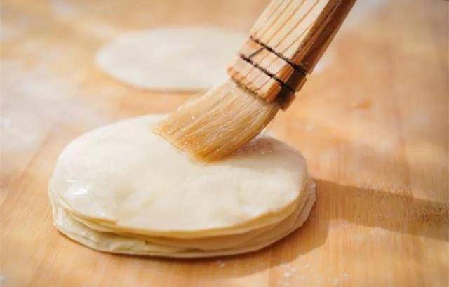第二步:半小時之後再把面團取出,將面團切成小段,然後像搟餃子皮一樣的把面團搟成薄片,八鋼好的面皮上面抹上玉米油,然後在把另一片面皮疊加在上面,這樣依次地將面皮上面抹上玉米油,然後疊加一直將面皮全部疊加在一起。