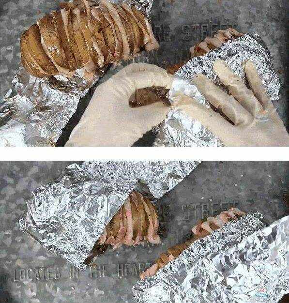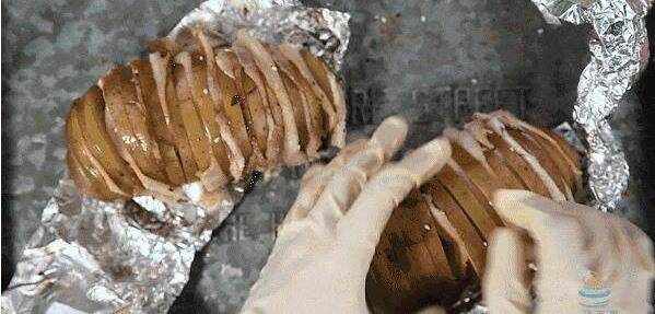 將馬鈴薯烤到外表皮有枯燥的褶皺這種香味是最濃的,而培根由於有蓋錫紙,又夾在夾層中,所以並不會被烤的很幹。