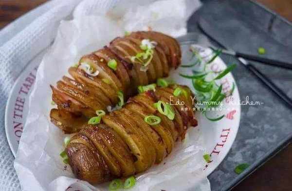 烤箱中取出烤軟馬鈴薯,將切好的培根夾在每層馬鈴薯裡,留意別弄斷馬鈴薯哦,夾好後能夠用牙簽將其固定住。