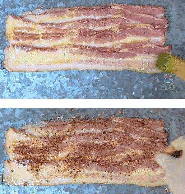培根外表均勻塗上一層橄欖油,依次撒上孜然粒,白芝麻,辣椒粉,醃制10分鐘。給孩子吃或許不喜辣的朋友能夠不加辣椒粉。一朵加瞭一點吃川味火鍋用的蘸水調料粉,滋味也很棒。