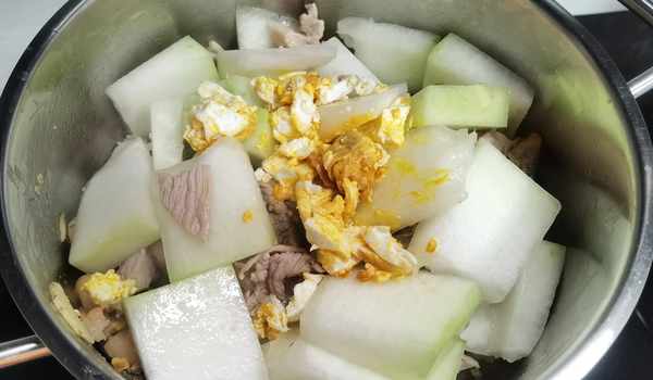 3.下冬瓜翻炒片刻,倒入咸蛋