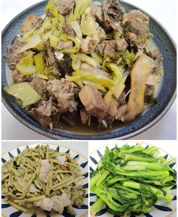 今日菜式:鴨肉燜酸菜,花肉炒蕨菜,蒜蓉白菜心。