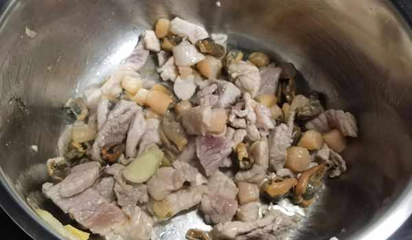 2.熱鍋下油,倒入瑤柱淡菜瘦肉煸炒出香味