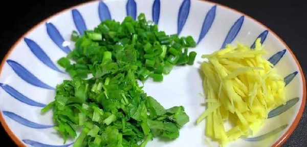 一塊去皮生薑,切成細絲,幾根小香蔥切成蔥花,一小把香菜改刀切成香菜碎,裝入碗中。