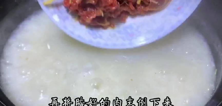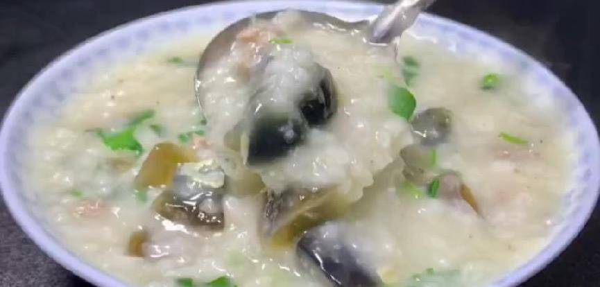 時間差不多瞭,現在大米已經完全煮熟,加入剩餘的薑絲,皮蛋,繼續用中小火煮5-6分鐘,調味加入食鹽,少許胡椒粉,一點雞精,用勺子攪拌一下將調味攪拌均勻。