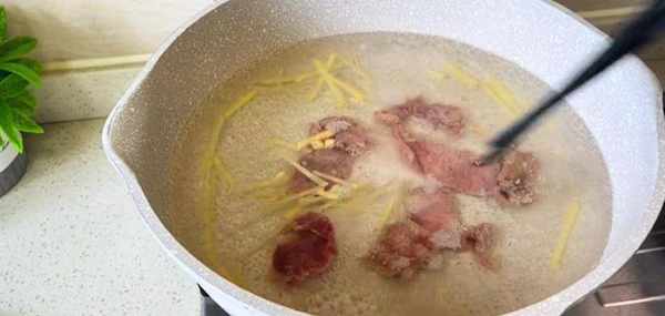鍋裡放適量清水,加入薑絲,煮開後把醃好的牛肉,一片一片下入鍋中,煮開後煮一分鐘。