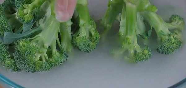 準備一個容器,加入一小勺食鹽,加入兩小勺面粉,加入適量水,用手攪勻化開,把切好的西蘭花頭朝下,浸泡在食鹽面粉水裡面。