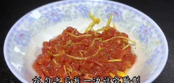 取一半薑絲加入肉沫裡,加入一小勺料酒,兩小勺生抽,適量胡椒粉,下手抓拌均勻,加入少許食用油鎖住水分,放一邊醃制一會。