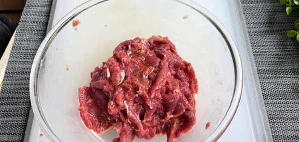 準備一塊牛裡脊肉,切成薄片,裝入碗中。