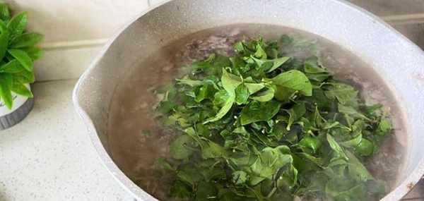 調味加鹽,攪拌均勻,關火下入洗凈的枸杞葉。