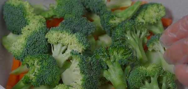 準備一個不粘鍋,加入少許食用油,把切好的胡蘿卜倒進來,用筷子鋪平整一些,再把切好的西蘭花菜梗倒進來,按同樣的方法整理一下,再把瀝幹水分的西蘭花加進來,也按照同樣的方法整理一下,往裡面倒入一碗純凈水,再扣上鍋蓋,開大火先將它煮三分鐘。
