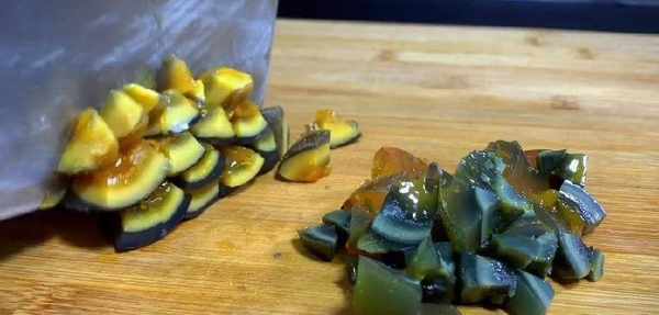把涼透後皮蛋,剝去外殼,切成小塊,先裝入碗中。
