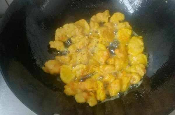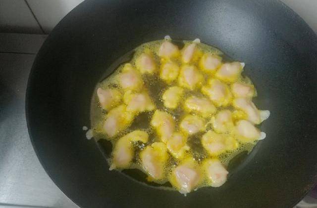 6、鍋中放適量的油,油溫燒至50度左右,把掛好面糊的雞丁一個一個放入油鍋中炸至兩面金黃後撈出。