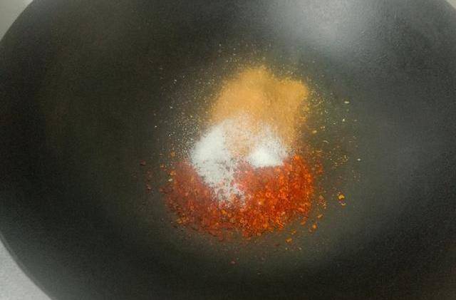 4、鍋中放入5克花椒粉,5克辣椒粉,1勺鹽用小火幹炒2分鐘後熄火盛出,這個是後面用來蘸著吃的。