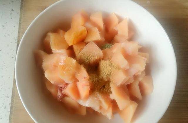 2、5克五香粉,1勺鹽,半勺雞精放入切好的雞丁中,攪拌均勻醃制10分鐘。