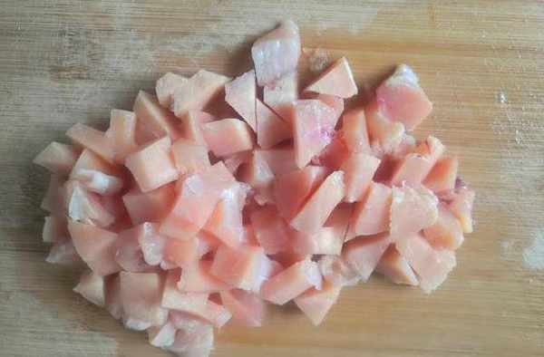 1、將雞脯肉切成1CM大小的小塊,記住不要切得太大,那樣不好入味也不容易熟。