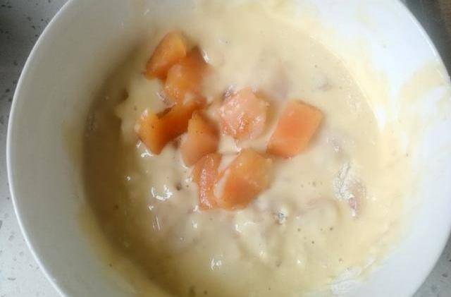 5、醃制好的雞丁放入面糊中,讓它們每一面都掛上面糊。