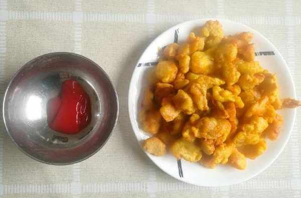 7、第一遍全部炸好之後,將雞米花重新放回鍋中,快速炸第二次,然後控油撈出。這個時候配上事先準備好的番茄醬就可以開始享用瞭。