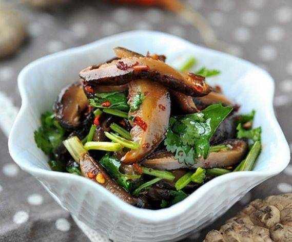 紅油茶花菇:幹花菇用溫水泡開,沖洗下,去蒂,入開水鍋中焯熟(約1分鐘即可),把焯好的花菇撈出,稍涼後用手擠幹水分,切成片,香菜摘洗幹凈,切成小段,把切好的花菇和香菜碎放入大碗中,放點鹽、雞精、一大勺白糖、一小勺紅辣椒油、一小勺花椒油拌勻後靜置幾個小時,入味後即可食用,味道真的很不錯。