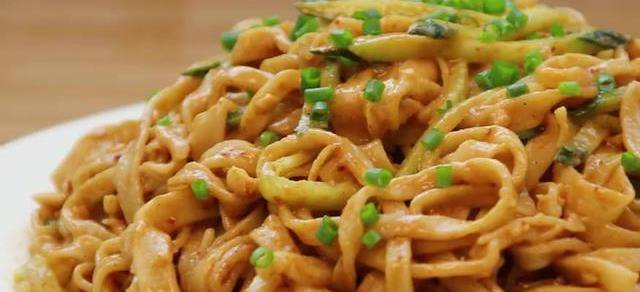 最後搟成兩毫米薄面片為止,撒上薄面粉,然後來回對折起來,從中間一分為二,根據個人喜好切成細面條和寬面條,鍋中水開放一勺鹽,下面條煮熟,拉出放入涼白開中,過涼,放兩勺自制芝麻醬,一勺辣椒油,一勺生抽一勺香醋,一勺芝麻油,一勺蒜水攪拌均勻。香辣勁道爽滑好吃,愛吃面條的朋友一定要試試。