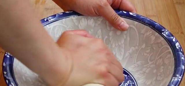 兩個蛋清增加筋性和爽滑口感,一勺鹽用100毫升涼水化開,食鹽溶液可加強對面筋形成邊倒水邊攪拌面粉,攪拌去狀後下手揉成面團,面團一定要硬一點。這時的面團表面並不光滑,用濕紗佈蓋上靜置10分鐘後揉面。揉好後蓋上濕紗佈,浸制一個小時左右。