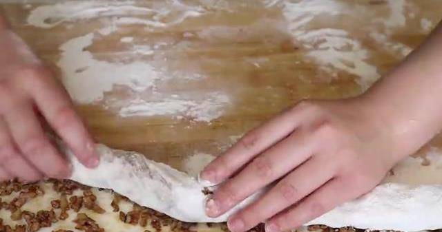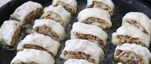 再用搟面杖搟薄,搟成長方形,我們再把肉餡鋪在上面,所以像這樣把它卷起來,再切成小塊,起鍋預熱,在裡面多倒上一點食用油,把切好的小肉籠放入電餅鐺裡面。煎至底面定型,我們在裡面加入1/3的水,蓋上蓋子悶上6~7分鐘,像這樣水分已經煎幹瞭,摁一下不塌陷,這樣就已經熟瞭,這樣做出來的小肉籠特別的好吃,底部是金黃酥碎的味道特別的香。
