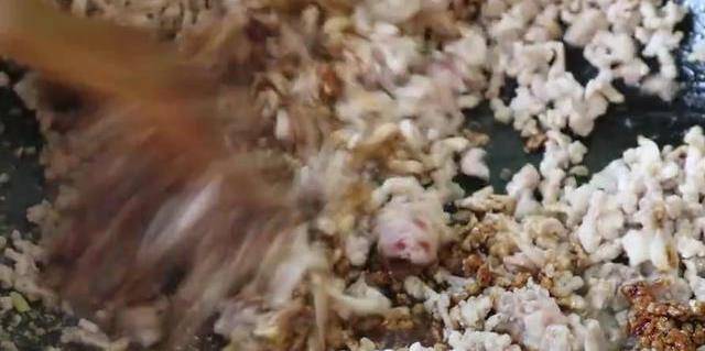 下面我們在鍋中倒點食用油,油熱以後放入薑塊,炒出香味以後,我們再把之前攪好的肉餡倒入裡面。肉餡炒至變色以後,我們在裡面加點生抽老抽上下色。炒好以後放進一個大碗中。